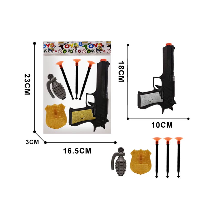 Пістолет арт. 233-28 (600шт/2) 3 стріли на присосці, значок, граната, пакет 23*3*16, 5см
