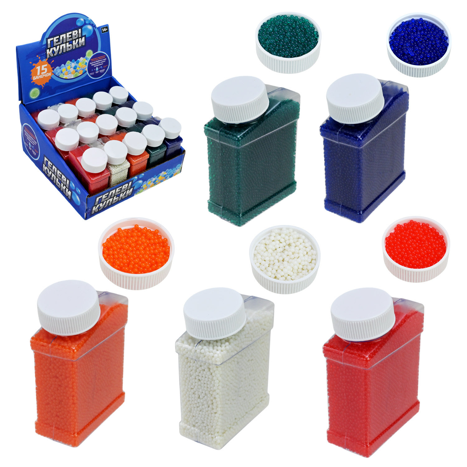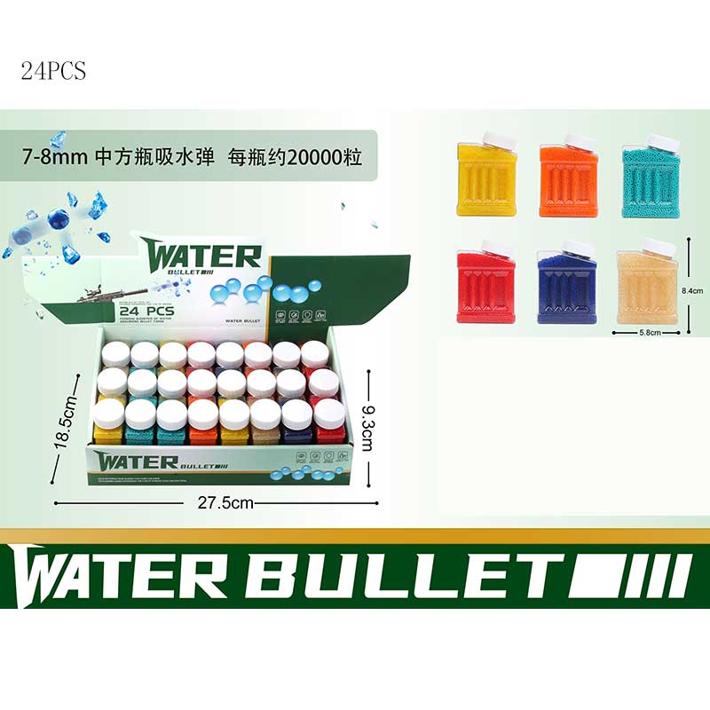 Пульки гідрогель арт.232-11 (240шт) 16уп по 15шт 20 тис.у пляшці, 5 кольорів, 7-8мм, 15 шт в дисплей боксі 18*18см