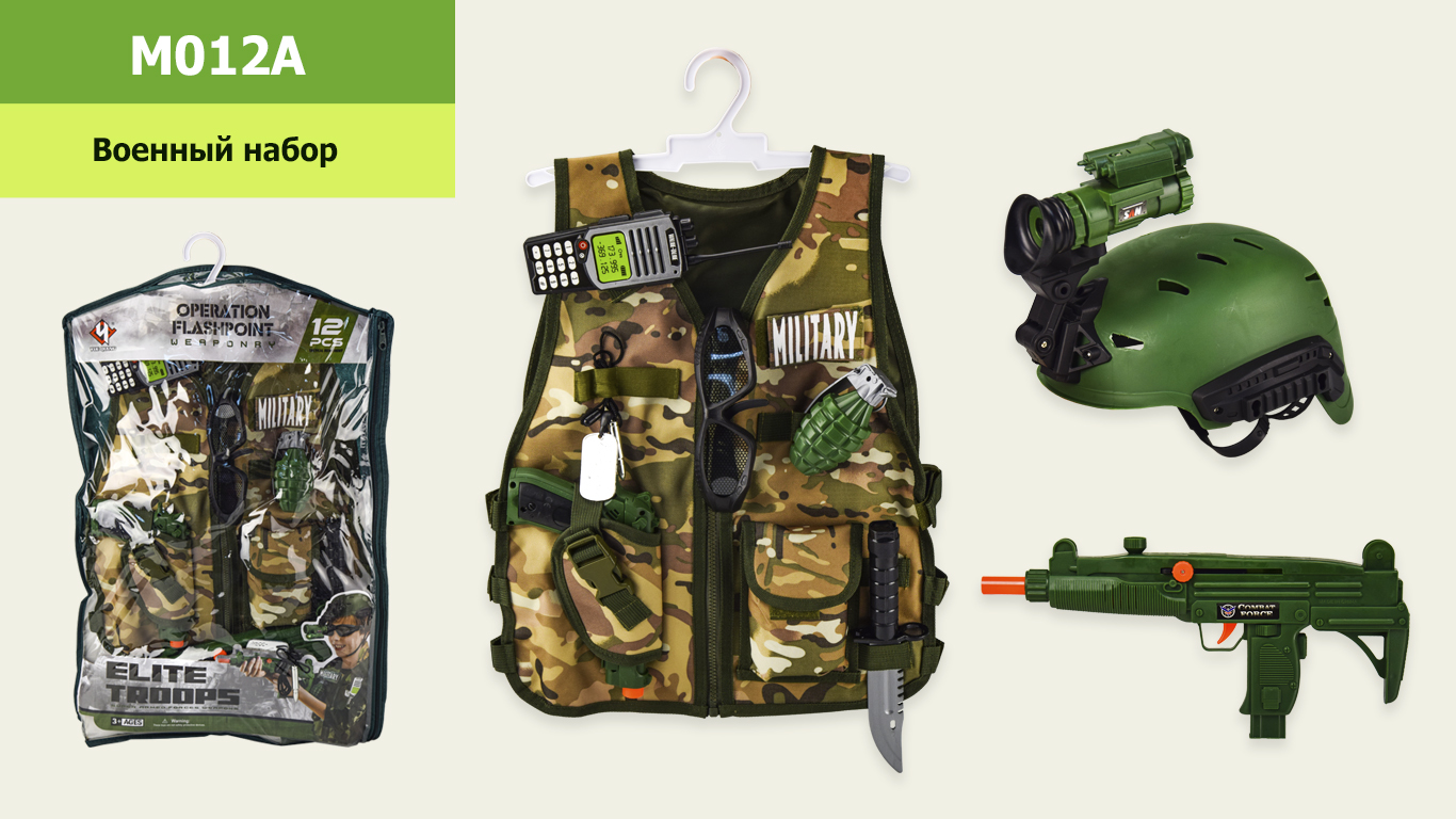 Іграшковий набір військового M012A (12шт/2) костюм, шолом, Іграшка пістолет, граната, багнет-ніж і ін, у пакеті 64 * 42 * 10см, р-р жилета - 37 * 47 см